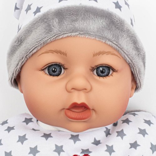 Krásná dětská panenka PlayTo. Skvělá hračka pro každou holčičku, která bude mít svoje mluvící miminko. Hlava, ruce a nohy jsou vyrobeny z gumy, tělíčko pak z měkkého materiálu, díky čemuž se může dítě k panence krásně přitulit. Panenka má dudlík. Panenka má milou tvářičku, která vypadá jak opravdové miminko a získá si srdce holčičky svými modrými kukadly a růžovými rtíky. Má roztomilé oblečení a čepičku. Oblečení lze sundat a vyprat. Délka panenky je 46 cm, je zabalená v barevné krabici a hodí se jako milý dáreček. Panenka má modul, který mluví 4 jazyky: polsky, česky, slovensky a maďarsky.Modul po stisknutí přehrává 5 písní a mluví 14 českých vět.