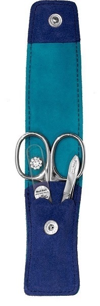 Cestovní sada s pouzdrem z pravého semiše s kytičkou z čirých krystalů se vejde do každé kabelky či příručního zavazadla. Zárukou výjimečné kvality je místo výroby manikúrových nástrojů, které pochází z německého města Solingen.