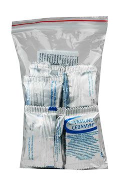 Cevamune je šumivá tableta obsahující modré barvivo a chlór-neutralizující složku.