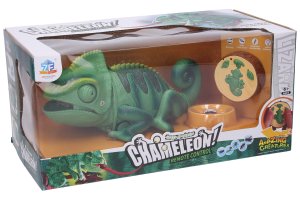 RC Chameleon s vystřelovacím jazykem. Velikost 28 cm. Světelné efekty (změna barev, 5 barev). Funkce - rotace očí, pohyb ocasem, vystřelovací jazyk, pohyb do 4 směrů. Obsahuje 5 žetonů a ovladač. Posbírejte žetony s obrázky hmyzu pomocí jazyku. Napájení ovladač 2 x AAA baterie, chameleon 4 x AA baterie. Návod k použití na obalu.