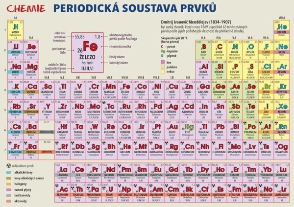 Laminátová kartička určená především pro žáky základních a středních škol nabízí graficky přehledné a stručné znázornění periodické tabulky chemických prvků. U každého prvku jsou uvedeny veškeré základní údaje, tedy český i latinský název, protonové číslo, relativní atomová hmotnost, elektronegativita, oxidační čísla, ale i značka pro případnou radioaktivitu. Druhá strana kartičky nabízí přehled těch nejdůležitějších a nejužitečnějších doplňkových informací – např. koncovky oxidačních čísel, chemické vazby, veličiny, jednotky a vzorce.