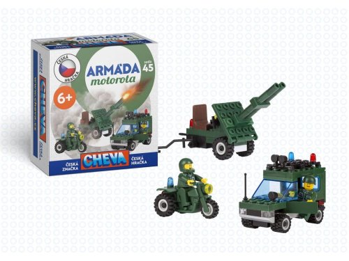 Stavebnice obsahuje vojenské dělo, terénní auto, motorku a dvě postavičky vojáků. Auto má navíc otvírací zadní dveře úložného prostoru. Postavičky lze umístit do auta, děla i motorky. Stavebnice je vyrobena z velmi kvalitního plastu. CHEVA je variabilní polytechnická stavebnice složená z řady stavebních dílů a doplňků. Všechny stavebnice označené touto ochrannou známkou jsou mezí sebou plně kompatibilní. Počet dílků: 123ks