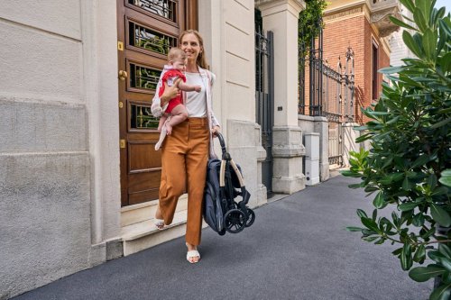 Samoskládání Stačí jeden dotek a kočárek se sám složí! Po složení je opravdu kompaktní a stojí samostatně. Madlo lze také poskládat pro dosažení větší kompaktnosti nebo může být použito jako rukojeť pro přenášení.