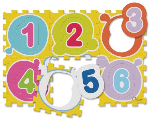 Měkká a přesto stabilní pěnová podložka se šesti vyjímatelnými číslicemi od známé italské značky CHICCO je vhodný pro první skládání i pro rozlišování barev. S velkými dílky se snadno manipuluje a barevné pozadí napomáhá ke správnému umístění. Pěnový koberec CHICCO je bezpečný, omyvatelný a jako hrací podložka tvoří izolaci mezi chladnou podlahou a tělíčkem dítěte. Pěnové puzzle je lehce manipulovatelná a skladná a je určena pro děti od 12 měsíců . Pěnové puzzle s 6 díly je vyrobeno ze speciálního materiálu (nejedná se o klasickou vroubkovanou EVA pěnu, ale o materiál podobný silné karimatce nebo několikavrstvému mirelonu). Doporučeno pro děti od 1 roku. Vyrobeno v Itálii.