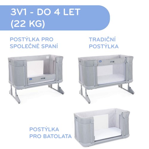 Postýlka Chicco Next2Me Forever představuje revoluční řešení spánku 3v1, které umožňuje rodičům a dětem spát u sebe tak dlouho, jak chtějí a potřebují. Díky patentovanému systému je lepší spánek pro rodiče a dítě zcela bezpečný. Pouze v jednom produktu najdete 3 různé funkce: dětskou postýlku do 4 let, tradiční postýlku a postýlku na zemi ve stylu Montessori pro batolata.