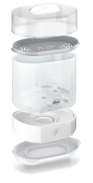 Proč vůbec sterilizovat? Bolesti bříška, koliky, průjem a zvracení často doprovázejí nedostatečnou hygienu při manipulaci s kojeneckými předměty ke krmení. V prvních měsících života jsou děti velmi citlivé na bakterie, mikroby a viry, jelikož jejich imunitní systém ještě není plně vyvinut. Sterilizátor spolehlivě ničí choroboplodné zárodky všeho druhu, které se šíří na lahvích, dudlících a jiném příslušenství lahví. Modulární sterilizátor 3v1 značky Chicco eliminuje 99,9% všech choroboplodných zárodků a sterilizuje bez chemických přísad.