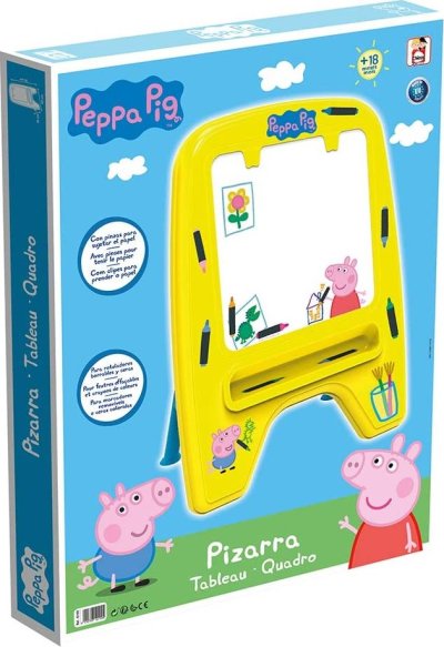 Pro psaní fixem na tabuli a voskovkami. V horní části rámu jsou spony pro připevnění papíru. Polička pod tabulí slouží jako odkládací plocha pro kreslící pomůcky. Samolepky s prasátkem Peppou pro ozdobení tabule. Rozměry tabule po složení: 59 x 33,5 x 75 cm Vhodné pro děti od 18 měsíců.
