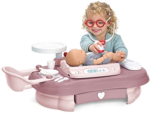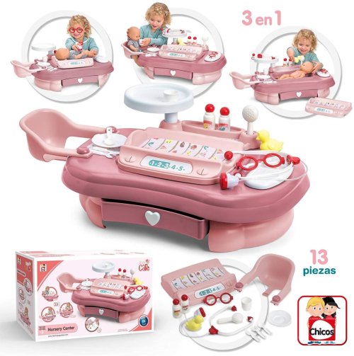Péče o miminko 3v1 od CHICOS nabízí mnoho variant báječné zábavy pro všechny malé maminky a tatínky. Obsahuje vanu pro koupel miminka, židličku na krmení a pediatrické centrum, kde paní doktorka zkontroluje, jestli je vše v pořádku. Obsahuje 11 ks příslušenství a doplňků. Vhodné pro hru s panenkou do cca 32 cm , není součástí balení ,. Vhodné pro děti od 3 let. Rozměry pultu: 80,5 x 44 x 25 cm