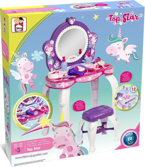 Toaletní stolek zdobený obrázky jednorožců je stylovým doplňkem pro všechny princezny, modelky, kadeřnice a všechny malé parádnice. Sada obsahuje: