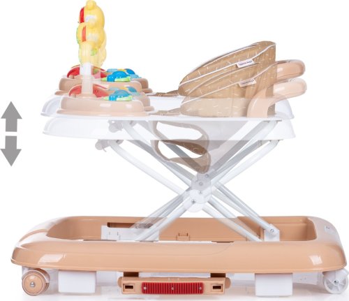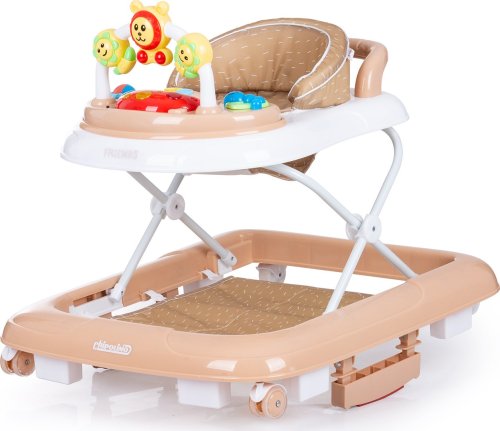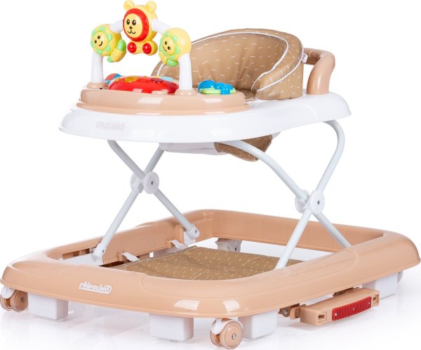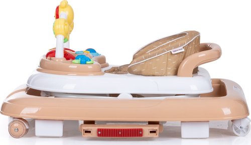 4v1 = chodítko (bez textilní základny), houpátko , hrací centrum (dítě šlape na textilní základnu a hraje si s hračkami) a postrkovací hračka pro první krůčky široká základna pro lepší stabilitu 3 výškové polohy sedátka, které odpovídají výšce dítěte 6 zarážek zabraňujících převrácení nebo pádu ze schodů 4 kolečka - přední kolečka se otáčejí o 360 stupňů barevný pultík s hračkami a hudebním panelem (lze odpojit a používat samostatně) snadno se skládá a skladuje snadná montáž