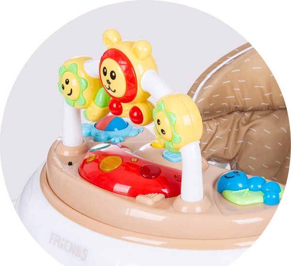 Multifunkční chodítko je vhodné pro děti od 6 měsíců s hmotností do 12 kg, které ještě neumí samy chodit, ale umí samostatně sedět. Chodítko 4v1 Friends podporuje pokusy dítěte o první krůčky a zlepšuje jeho rovnováhu a koordinaci. Barvy a zvuky na pultíku s hračkami podněcují kreativitu dítěte a rozvíjejí jeho sluchové a zrakové schopnosti.