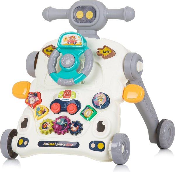 multifunkční hračka - lze ji použít jako stoleček na hraní nebo jako chodítko hudební hračka pro děti od 6 měsíců chodítko ke tlačení pro děti, které umí samostatně chodit volant lze může otáčet různé druhy her pro delší udržení pozornosti batolat melodie, světla a zvuky pohodlné, lehké a snadno se tlačí výškově nastavitelné možnost umístit na spodní stranu panelu láhev s vodou pro zvýšení hmotnosti a stability hračky pro provoz výrobku jsou třeba 2 ks 1,5V baterií AAА (nejsou součástí balení) rozměry: 41 x 41 x 44 cm