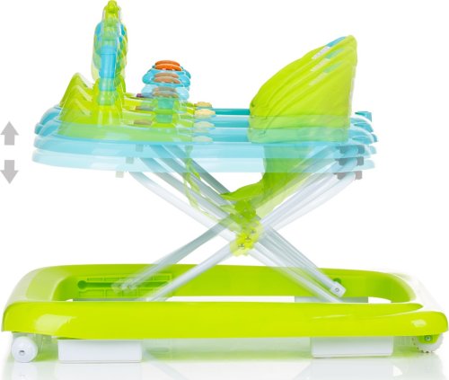 široká základna pro lepší stabilitu 3 výškové polohy sedátka, které odpovídají výšce dítěte 6 zarážek zabraňujících převrácení nebo pádu ze schodů 4 kolečka - přední kolečka se otáčejí o 360° pultík s interaktivním panelem a hrazdičkou snadno se skládá a skladuje snadná montáž