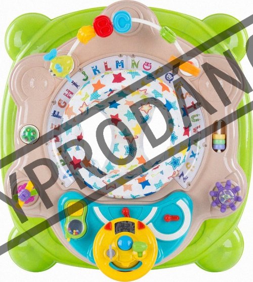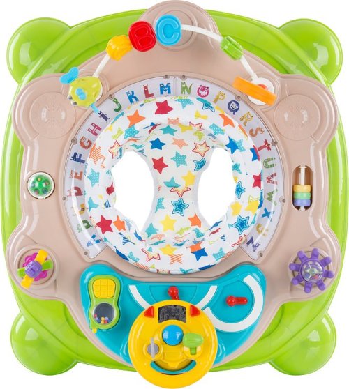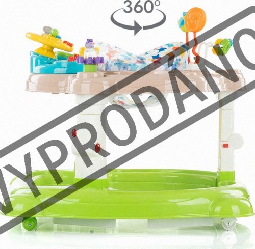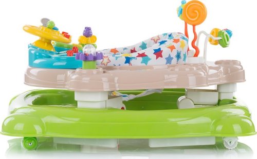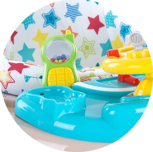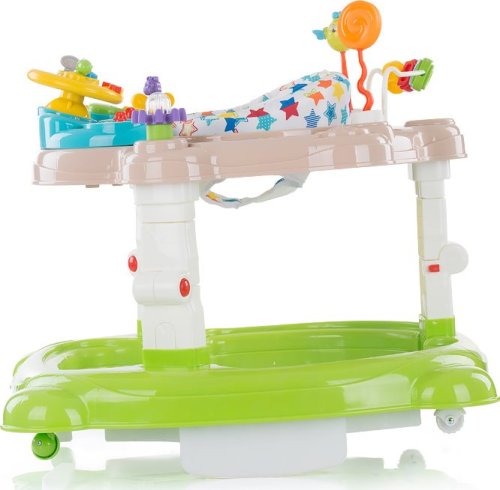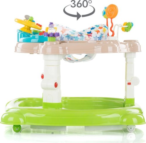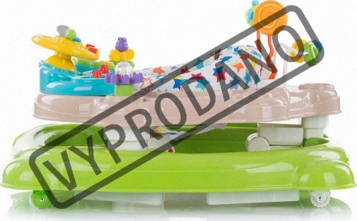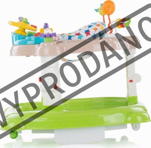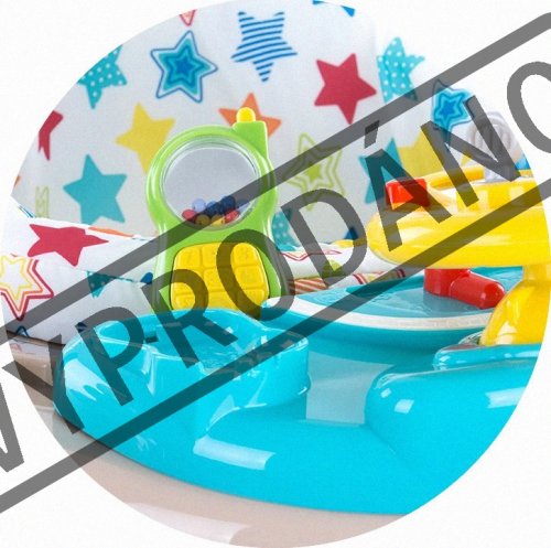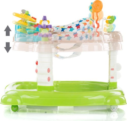 4v1 = chodítko , houpátko , skákadlo (s pružinami) a hrací centrum (hraje si s hračkami) široká základna pro lepší stabilitu otočné sedátko o 360° (dítě dosáhne na všechny hračky) 3 výškové polohy sedátka, které odpovídají výšce dítěte 6 zarážek zabraňujících převrácení nebo pádu ze schodů 4 kolečka - přední kolečka se otáčejí o 360 stupňů barevný pultík s hračkami a hudebním panelem malý telefon lze odpojit a používat samostatně snadno se skládá a skladuje snadná montáž