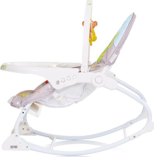 vhodné pro kojence a malé děti s hmotností do 9 kg lze použít jako židli pro děti, které mohou samostatně sedět, s maximální hmotností 18 kg dvě polohy opěradla příjemné melodie v kombinaci s uklidňujícími vibracemi, hrazdička se zavěšenými hračkami odnímatelný plastový pult 3-bodové bezpečnostní pásy houpání lze jednoduše zablokovat
