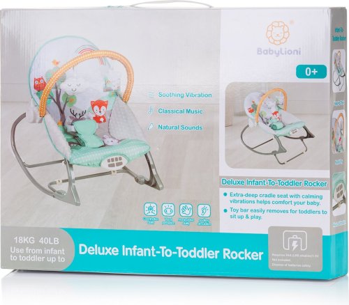 vhodné pro kojence a malé děti s hmotností do 9 kg do věku přibližně 6 měsíců, lze použít jako židli pro děti, které mohou samostatně sedět, s maximální hmotností 18 kg do věku 36 měsíců, dvě polohy opěradla, houpací funkce, příjemné melodie v kombinaci s uklidňujícími vibracemi, hrazdička se zavěšenými hračkami, 3-bodové bezpečnostní pásy, pro provoz jsou třeba 3ks AA,1,5V baterií (nejsou součástí balení), rozměry houpátka: 47 x 66 x 58 cm.