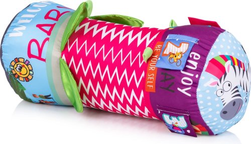 ideální pro cvičení na bříšku, pomáhá posilovat zádové, krční a pažní svaly, obsahuje barevné vzory a měkké hračky pro smyslový rozvoj, lehký, snadno přenosný a vždy připravený ke hře, perfektní pro rané fáze vývoje, kdy miminka objevují radost z pohybu, rozměry polštáře: 44 × 14 × 14 cm.