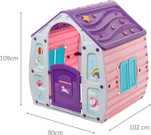 vhodný pro vnitřní i venkovní použití, domeček s funkčními dveřmi, okny a okenicemi, otvor pro poštu na dveřích, aby děti mohly přijímat vzkazy od rodiny a přátel, lehká konstrukce - snadno se přenáší, snadná montáž bez nutnosti použití nářadí, odolný vůči UV záření, rozměry (ve složeném stavu): 109 x 90 x 102 cm.
