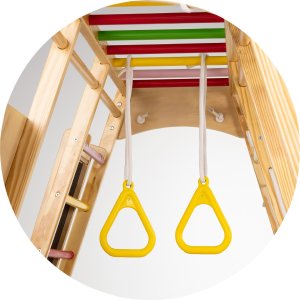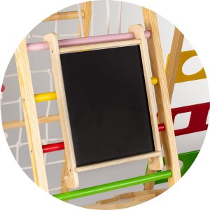 lezeckou stěnu s barevnými úchyty, lezeckou síť, gymnastické kruhy, houpačku, desku na klouzání a lezení, gymnastický žebřík, žebřiny, magnetickou tabuli.
