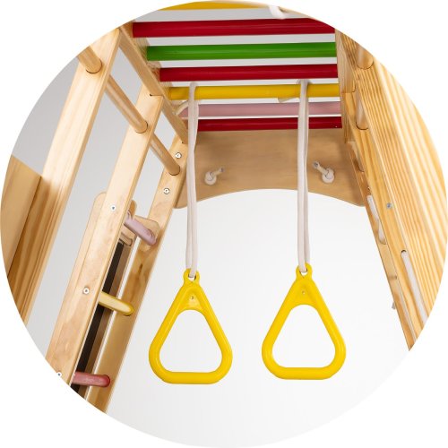 lezeckou stěnu s barevnými úchyty, lezeckou síť, gymnastické kruhy, houpačku, desku na klouzání a lezení, gymnastický žebřík, žebřiny.