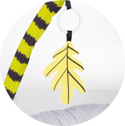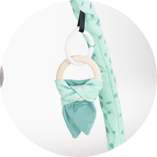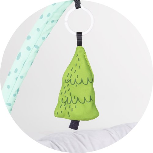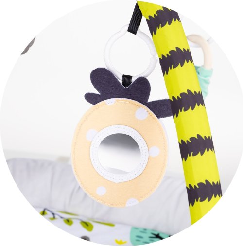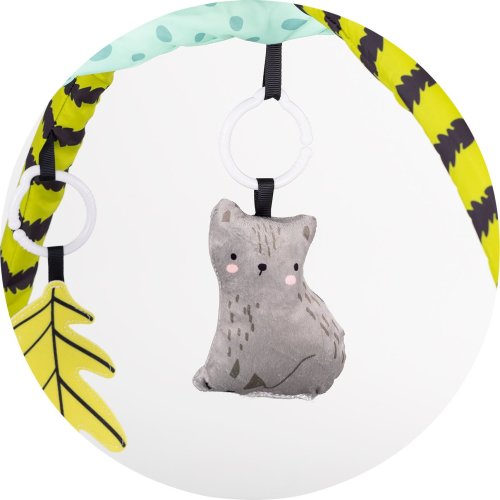 Měkká plyšová tkanina s rozdílnou texturou, dva oblouky s pěti závěsnými hračkami, hračky lze snadno odepnout a dle potřeby vyprat, přídavná polstrovaná část zajišťuje bezpečí dítěte, podložku a hračky lze prát ručně při max teplotě 30°C, hračka byla vyrobena v souladu s požadavky evropských směrnic a norem týkajících se bezpečnosti hraček.