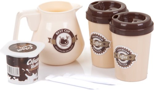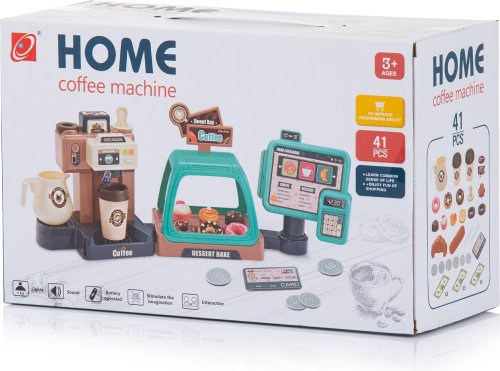 obsahuje 41ks příslušenství - kávovar s nádržkou na vodu, šálky a nástroj na lisování kávy, mince a bankovky, pokladnu a stojan na zákusky, interaktivní hračka se zvuky a světly, funkce zapnutí,vypnutí pro přípravu nápoje, otočná obrazovka, pro provoz jsou třeba baterie 4ks AA,1,5V - 2 baterie do kávovaru a 2 baterie do pokladny (nejsou součástí balení), před použitím hračku umyjte.