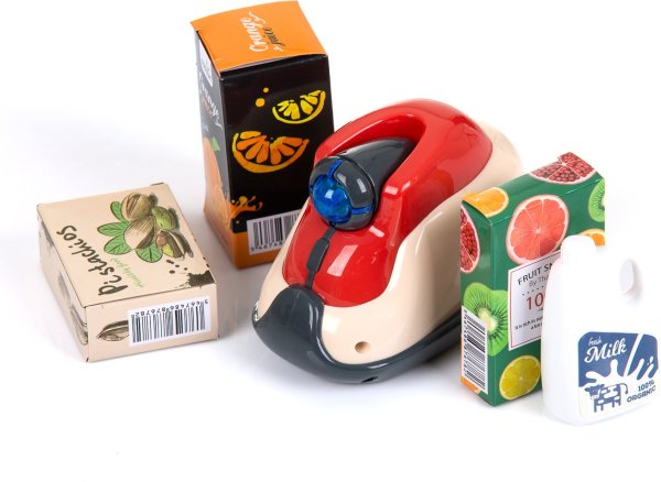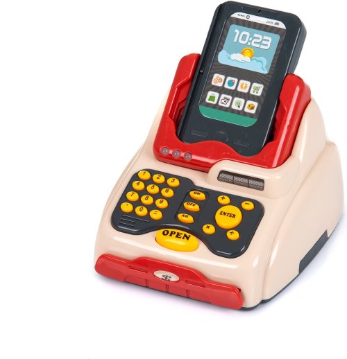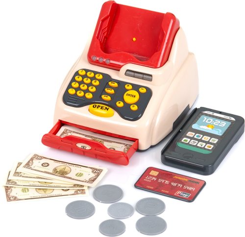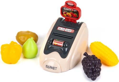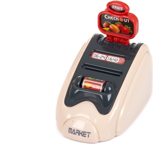 obsahuje 24ks příslušenství - podkladnu, mince, bankovky, platební kartu, mobil, potraviny a další, interaktivní hračka se zvuky a světly, pro provoz jsou třeba baterie (nejsou součástí balení): 2ks AAA,1,5V pro terminál + 2ks AA,1,5V pro skener + 2ks AA,1,5V pro pokladnu.