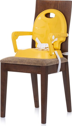 pro samostatně sedící děti široký a pohodlný sedák 30-35 cm bezpečnostní pásy opěradlo lze sklopit a složit opěrka nohou posouvatelný podnos dopředu a dozadu do 3 poloh snadné čištění protiskluzové krytky nohou madlo v zadní části opěradla pro snadnější přenášení podsedák lze použít jako nástavec na židli pro dospělé - upevnění pomocí pásů