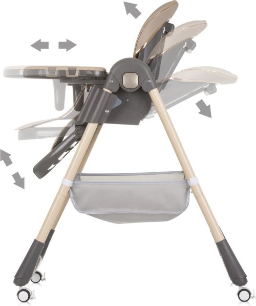 nastavitelná opěrka zad do 4 poloh, výškově nastavitelné sedadlo do 7 poloh, nastavitelná opěrka nohou do 2 poloh, široký a pohodlný sedák z EKO kůže, 5bodové bezpečnostní pásy s měkkými ramenními polštářky, dvojitý podnos na potraviny - horní podnos je odnímatelný pro snadné čištění, základní podnos na potraviny je vybaven ochrannou T-tyčí, posouvatelný podnos dopředu a dozadu do 4 poloh, hrazdička s hračkami pro zábavu, 4 kolečka pro snadné přemisťování, úložný koš na hračky a příslušenství, kompaktní pro skladování, rozměry židličky: 68 x 51 x 110 cm, rozměry složené židličky: 30 x 51 x 95 cm.