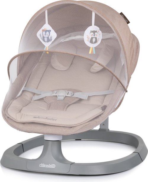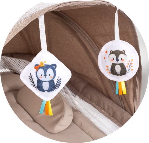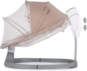 3 různé typy houpání s různými úrovněmi rychlosti, časovač na 15, 30 a 45 minut, různé melodie, poloha vleže a vsedě – vhodné pro spánek, krmení i hraní s dítětem, nastavitelné opěradlo do 2 poloh, rám s LED dotykovým displejem, stříška s měkkými plyšovými hračkami, měkká opěrka hlavy, bezpečnostní pás, moskytiéra, dálkové ovládání, napájení kolébky pomocí AC,DC adaptéru – AC: 100–240 V, 2.0 A (je součástí balení), rozměry výrobku: 80 x 55 x 70 cm.