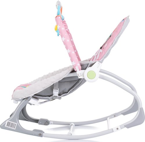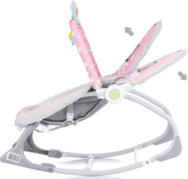 2v1 = houpátko a židlička, houpátko pro miminka a děti vě věku 0-6 měsíců vážící max 9 kg, které neumí samostatně sedět, židlička pro samostatně sedící děti vážící max 18 kg ve věku do 36 měsíců, nastavitelné opěradlo do 2 poloh, oblouk se závěsnými hračkami, houpací funkce, hudební box s melodiemi a vibracemi, 3-bodové bezpečnostní pásy, rozvíjí představivost a motoriku.