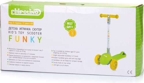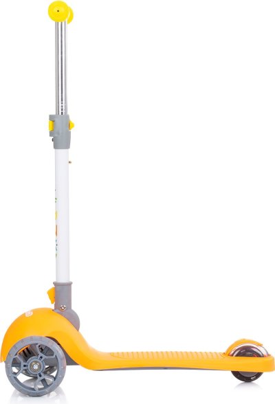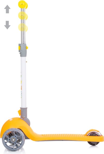 vhodné od 3 let, nosnost 50 kg lehký hliníkový rám výškově nastavitelná řídítka do 3 poloh gumové protiskluzové rukojeti průměr kol: přední 12 cm, zadní 8 cm přední i zadní kola s barevnými LED světly nášlapná brzda na zadním kole široké protiskluzové stupátko řídítka lze složit pro kompaktní skladování