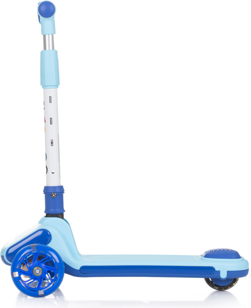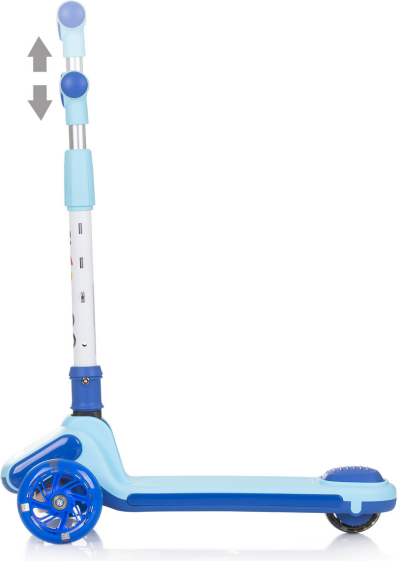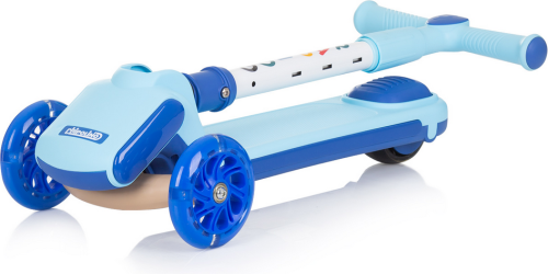 lehký hliníkový rám, výškově nastavitelná řídítka, gumové protiskluzové rukojeti, přední i zadní kola s barevnými LED světly, nášlapná brzda na zadním kole, široké protiskluzové stupátko, řídítka lze složit pro kompaktní skladování.