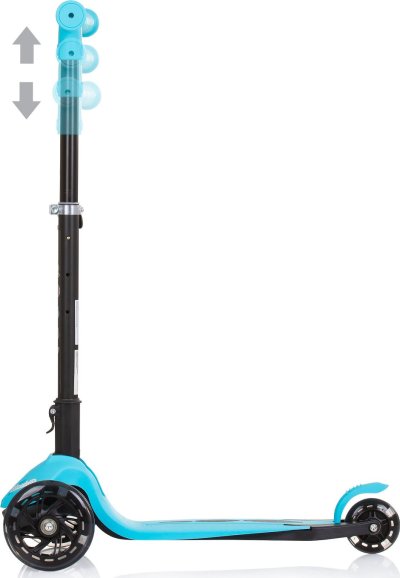 vhodné od 3 let, nosnost 50 kg lehký hliníkový rám výškově nastavitelná řídítka do 3 poloh gumové protiskluzové rukojeti průměr předních koleček: 120 mm přední i zadní kola s barevnými LED světly nášlapná brzda na zadním kole široké protiskluzové stupátko řídítka lze složit pro kompaktní skladování