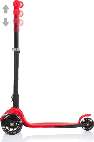 vhodné od 3 let, nosnost 50 kg lehký hliníkový rám výškově nastavitelná řídítka do 3 poloh gumové protiskluzové rukojeti průměr předních koleček: 120 mm přední i zadní kola s barevnými LED světly nášlapná brzda na zadním kole široké protiskluzové stupátko řídítka lze složit pro kompaktní skladování
