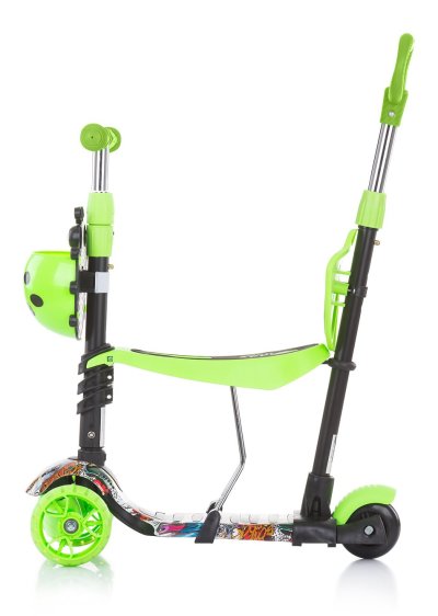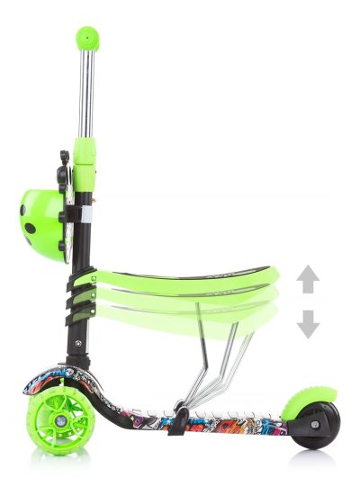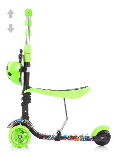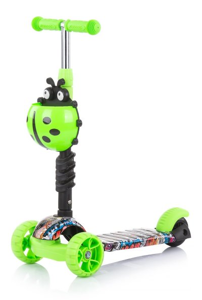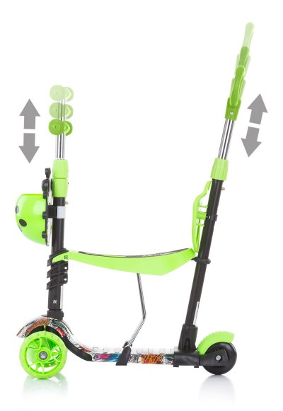 rodič může pomocí vodící tyče dítě tlačit dítě může samostatně jezdit na koloběžce nebo jako na odrážedle odnímatelná vodící tyč nastavitelné sedátko do 3 poloh od 22 do 29 cm nastavitelná řídítka do 3 poloh gumové protiskluzové rukojeti průměr koleček: přední 120 mm, zadní 80 mm nášlapná brzda na zadním kole přední kolečka s barevnými LED světly široké protisluzové stupátko úložný košík vpředu