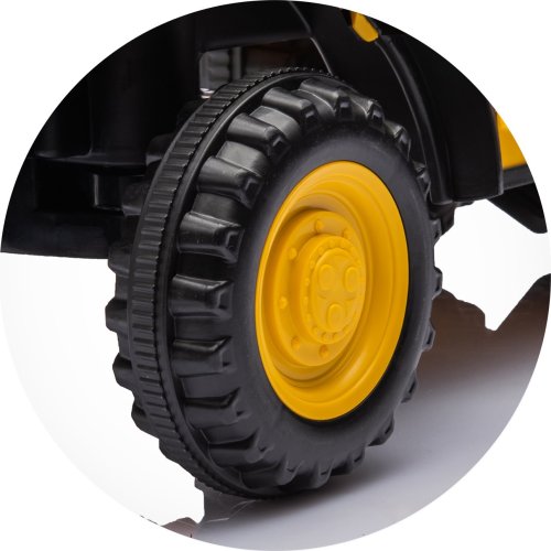 volant se zvukem klaksonu lze volně otáčet, přívěs pro přepravu dalších hraček, součástí balení je lopatka a hrábě, pohodlné a prostorné sedadlo, úložný prostor na potřebné věci pod sedadlem, pro provoz jsou třeba baterie 2x АA,1,5V (LR6) (nejsou součástí balení).