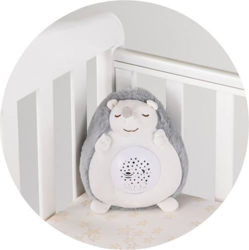 Každá hračka má vestavěnou hudební skříňku s 10 ukolébavkami a 5 druhy bílého šumu, které napodobují známé zvuky z dělohy i přírody. Jedním tlačítkem se aktivuje barevný LED projektor s různými kombinacemi červené, zelené a modré barvy, které se plynule střídají a dítě uklidňují. K dispozici jsou 3 úrovně hlasitosti a jednoduché ovládání pomocí intuitivních tlačítek. Hudební skříňku lze vyjmout, takže plyšovou část lze prát ručně při 30 °C. Pro provoz jsou potřeba 3ks baterie typu AAA (nejsou součástí balení).