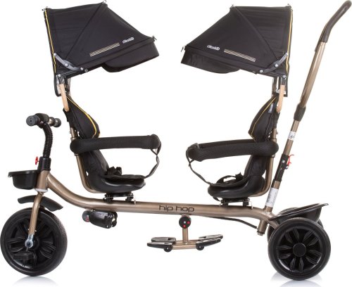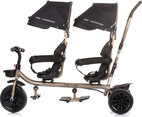 multifunkční výrobek se 2 různými způsoby použití - rodič děti tlačí nebo dítě vpředu tříkolku pohání pomocí pedálů dvě polohy předního sedadla - režim po směru jízdy a režim, kdy děti sedí čelem k sobě obě sedadla se otáčí o 360 stupňů obě sedadla jsou vybavena bezpečnostními madly pohodlná rukojeť pro rodiče dvě skládací a pohyblivé opěrky nohou blatníky na předním kole dvě velké skládací stříšky se slunečními clonami dvě široká a pohodlná sedadla s měkkým textilním potahem a bezpečnostními pásy úložné koše vpředu a vzadu brzdové pedály na zadních kolech kryt kola na předním kole, který zabraňuje zachycení dětských nohou