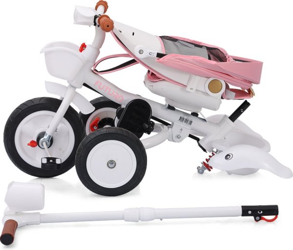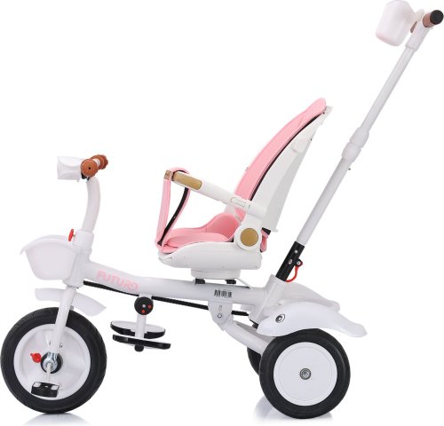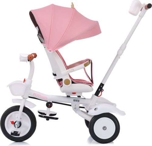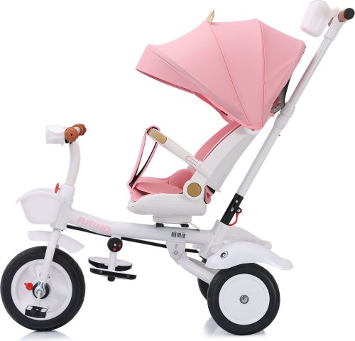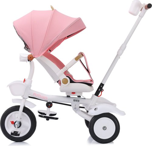 Multifunkční výrobek se 2 různými způsoby použití - rodič tlačí dítě nebo dítě samo řídí hračku pomocí pedálů, stříška, rodičovská rukojeť a ochranné madlo jsou odnímatelné, řídítka s hudbou a světlem - pro provoz jsou nutné 2ks baterií typ АА,1,5V, vysoce kvalitní gumová kola - přední 10", zadní 8"; sedačka je vybavena ochranným madlem a bezpečnostními pásy s měkkými ramenními vycpávkami, 2 polohy naklonění sedadla, 2 polohy otočení sedadla - sedadlo ve směru nebo v protisměru jízdy, rukojeť z eko-kůže výškově nastavitelná do 3 poloh, pohodlná výškově nastavitelná rodičovská rukojeť s držákem nápojů, skládací a pohyblivá podnožka, skládací stříška se sluneční clonou, široké a pohodlné sedadlo s měkkým polstrovaným textilním potahem, úložný koš vpředu a vzadu, kryt kola na předním kole, který zabraňuje zachycení nohou dítěte, přední kolo lze zablokovat, blatníky na všech kolech, jednoduché skladování - snadné sklopení opěradla i zadní část tříkolky.