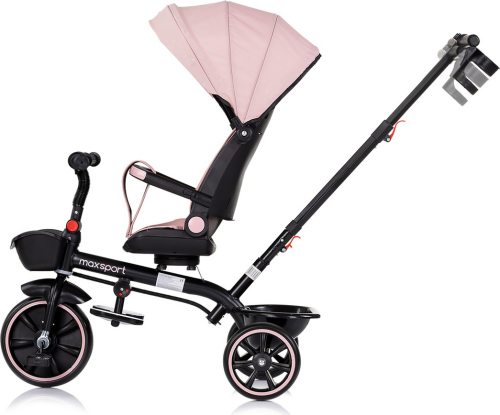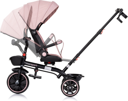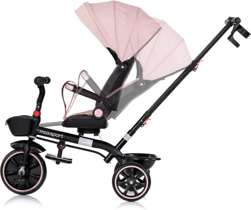 multifunkční výrobek se dvěma způsoby použití – rodič tlačí dítě nebo dítě hračku pohání samo pomocí pedálů, stříška, rukojeť pro rodiče a ochranný nárazník jsou odnímatelné, takže se tříkolka přemění na vozítko pro větší dítě, široké a pohodlné sedadlo s měkkým textilním polstrováním a bezpečnostním pásem, polohovatelné sedadlo, otočné sedadlo o 360°, sedadlo je vybaveno bezpečnostním nárazníkem, pohodlná rodičovská rukojeť s nastavitelnou výškou ve dvou polohách, držák na lahev,nápoj, který lze připevnit na rukojeť ve dvou polohách, sklopná a pohyblivá opěrka nohou, skládací stříška s sluneční clonou, úložný košík vpředu i vzadu.
