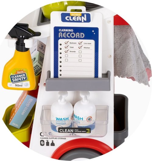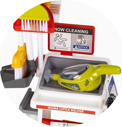 Chcete své dítě povzbudit k péči o domácnost a udržování čistoty, ale nevíte, jak na to? Skvělým řešením bude vozík s úklidovým příslušenstvím. Už dávno se ví, že nepořádek se sám neuklidí, ale vozík tuto práci rozhodně zpříjemní. Vlastnosti: