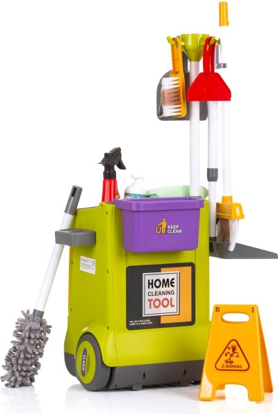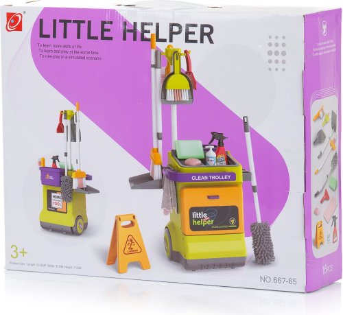 obsahuje 16ks příslušenství - vozík, smeták, smetáček s loupatkou, čistící prostředky, hadříky, ceduli a další doplňky, rozměry vozíku: 71 x 31 x 33,5 cm.