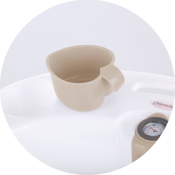 Lze používat na stojanu nebo samostatně, vestavěný teploměr automaticky zobrazuje změny teploty vody, aby voda ve vaničce nebyla pro dítě příliš horká nebo studená, ergonomické koupací lehátko podpírá novorozence a usnadňuje koupání, protiskluzový kryt na bocích vaničky, oplachovací kelímek ve tvaru srdce - lze jej použít při sprchování nebo hře s miminkem, vestavěný držák na mýdlo, vybaveno zátkou pro snadné vypouštění použité vody bez nutnosti zvedání vaničky, rukojeť pro snadnější přenášení vaničky, skládací stojan na vaničku pro pohodlí rodičů.