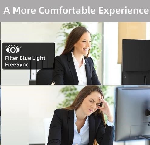 Konektory: Display Port, HDMI, Jack 3,5 mm, VGA Filtr modrého světla, Flicker Free, FreeSync VESA uchycení: 75 × 75