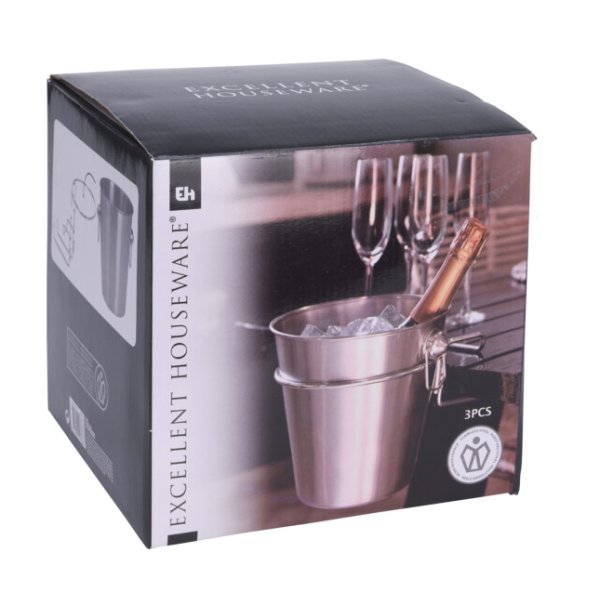 chladič na víno s držákem na stůl z nerezové oceli- perfektní pro servírování a chlazení vína, šampaňského nebo jakéhokoliv jiného alkoholu- šikovnou součástí této sady je držák na chladič, který lze jednoduše připevnit na desku stolu nebo baru- díky držáku nezabere kbelík na stole žádné místo- velmi dobrá izolace díky nerezovému provedení- posloužit může také jako kbelík na led- horní průměr 20 cm- výška: 20 cm- značka: EXCELLENT