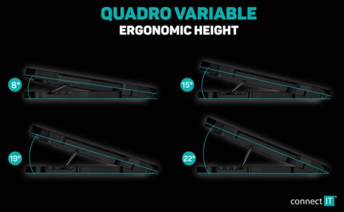 Podložka zajišťuje jak odvod tepla z notebooku a jeho ventilačních otvorů, tak i přímé ochlazování pláště notebooku díky cirkulaci chladného vzduchu a celkově tak zvyšuje výkon notebooku. Je plně kompatibilní s notebooky až do velikosti 15,6" a díky kompaktním rozměrům je předurčena jak pro práci doma a v kanceláři, tak i pro cestování a časté přenášení. Ultratichý chod 4 ventilátorů vás nebude rušit ani při nejnáročnější práci vyžadující maximální soustředění. Výšková polohovatelnost ve 4 různých stupních vám zajišťuje maximální pohodlí i při delších pracovních či herních sezeních.