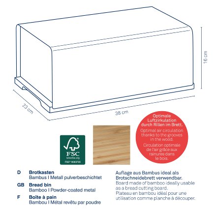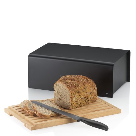 Moderní víko: Obdélníkové černé kovové víko se jednoduše umístí na základnu jako digestoř. Chrání váš chléb před vysycháním a dodává chlebníku moderní stylový vzhled.