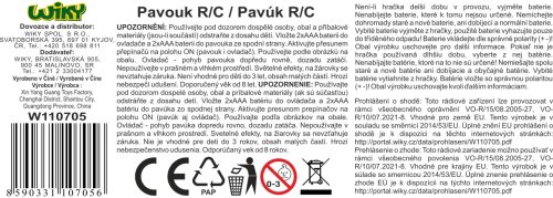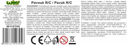 Baterie - pavouk 2x1,5 AAA, ovladač 2x1,5V AAA, nejsou součástí balení.