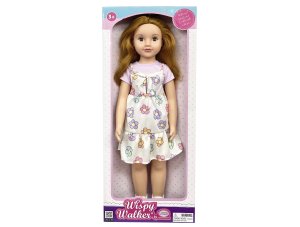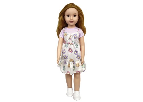 Chodící panenka v květinových šatech. Velikost 70 cm. Mrkací oči.